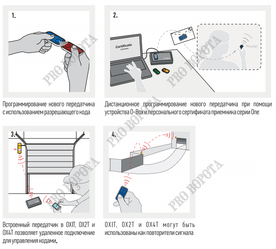 Благодаря встроенному передатчику в OXIT, OX2T и OX4T и используя программатор O-Box есть возможность дистанционно управлять кодами и функциями приемника (удобно для установок с ограниченным доступом к блоку управления) (рис.3).