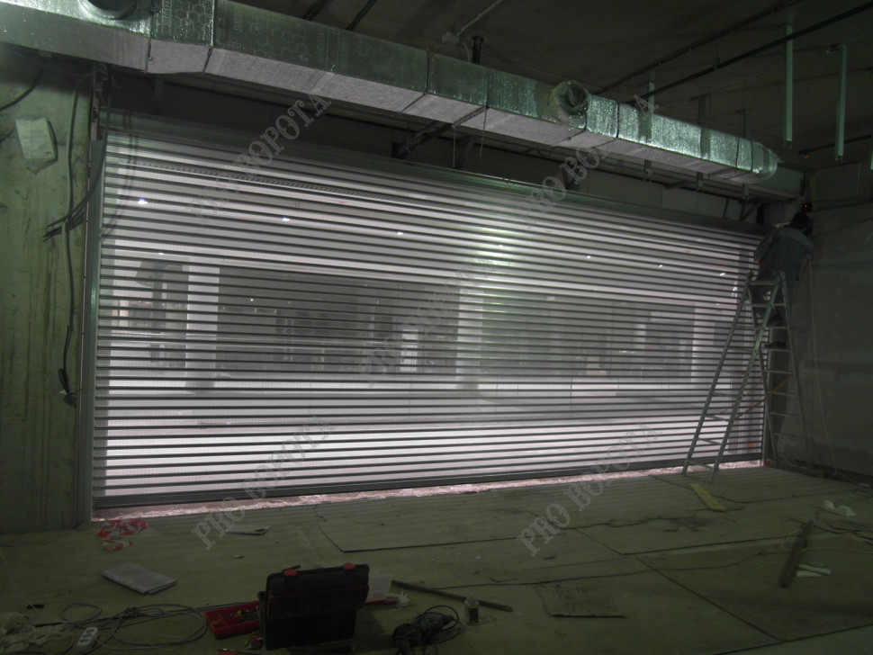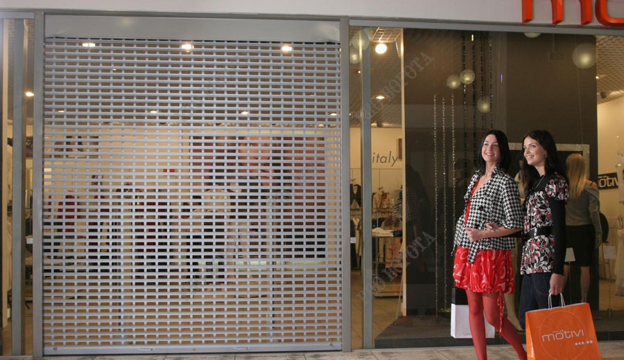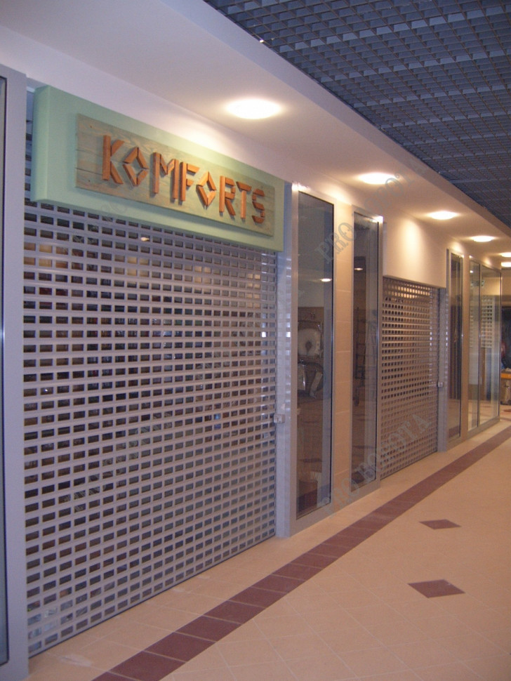Рольставни для торговых центров изготавливаются из стальной или алюминиевой ленты. На поверхности решетчатых рольставен располагаются круглые или прямоугольные отверстия разного размера, что делает ламель похожей на решетку.