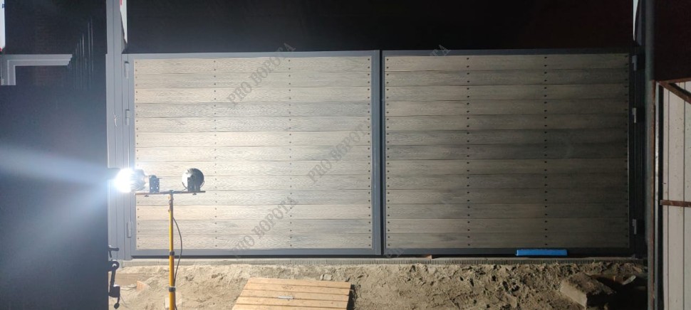 Ворота распашные, заполнение сендвич-панелями, в стальной раме